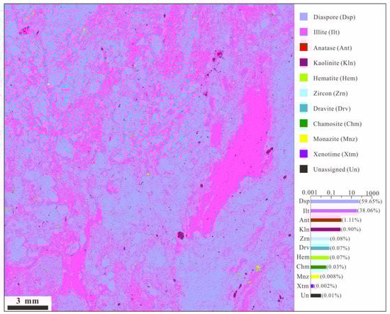 The mineralogical compositions detected by TIMA analysis show that the representative bauxite ore is composed mostly of diaspore (59.65%) and illite (38.06%), followed by minor amounts of anatase (1.11%), kaolinite (0.9%), zircon (0.08%), dravite (0.07%), hematite (0.07%), chamosite (0.03%), monazite (0.008%), and xenotime (0.002%) (Figure 5). Some other minerals were also detected by SEM-EDS, including pyrite, cassiterite, barite, chalcopyrite, galena, arsenopyrite, and REE minerals, such as monazite and xenotime (Figure 4g–i) [28].