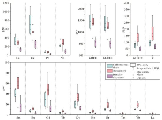 Boxplot of the rare earth elements contents in the bauxite ore, carbonaceous shale, and bauxitic claystone samples of the Lindai bauxite deposit (data from [28]).