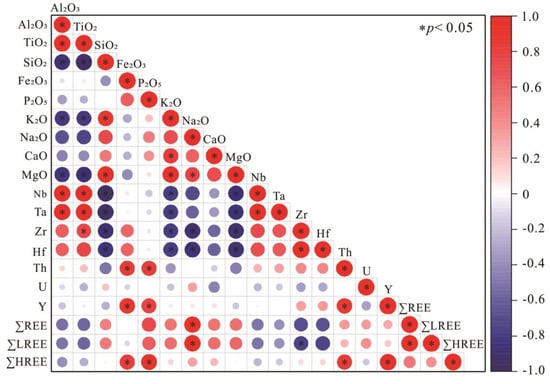 A correlation analysis (with a significance level of p < 0.05) (Figure 7) reveals that the ∑REEs and ∑LREEs have strong negative correlations (correlation coefficient of −0.68 to −0.76) with the Zr and Hf contents. The ∑REEs and ∑LREEs have high positive correlations (correlation coefficient of 0.77 to 0.81) with Na2O and weak or no correlations with Al2O3, TiO2, SiO2, Fe2O3, Nb, and Ta. Conversely, the ∑HREEs have significantly positive correlations (correlation coefficient of 0.81 to 0.96) with P2O5, Fe2O3, Th, and Y. The Th and Y contents have very strong positive correlations (correlation coefficient of 0.79 to 0.87) with the P2O5 and Fe2O3 contents.