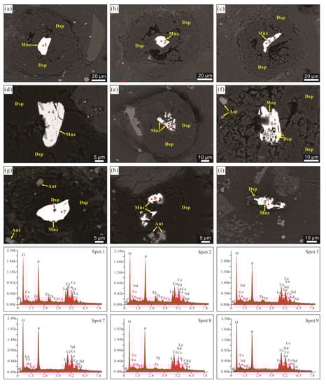 SEM backscattered electron (BSE) images of monazite and representative EDS spectra. (a,b) Detrital monazite presents subhedral crystals with rounded margins; (c) detrital monazite presents anhedral crystals with rounded margins; (d,e) detrital monazite presents discontinuous fragments; (f–i) authigenic monazite showing the coexistence of irregular monazite, cryptocrystalline diaspore, and euhedral anatase.