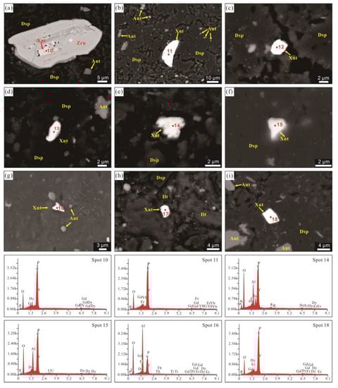 The detrital xenotime crystals are subhedral (Figure 10b–d), occurring as single crystals distributed in the matrices dominated by diaspore and illite or surrounded by zircon crystals (Figure 10a). However, the authigenic xenotime minerals are characterized by small anhedral (Figure 10e,f) and euhedral crystals (Figure 10g–i). In contrast to the monazite, the authigenic and detrital xenotimes generally contain, besides Y, substantial amounts of HREEs, such as Gd, Dy, Er, and Yb, but no LREEs (or they are below the detection limit of the EDS). Low Th and U contents are only sporadically detected in xenotime (Table S2). The occurrence of minor amounts of major elements, including Si, Al, Ti, and K, in the authigenic and detrital xenotimes can be explained by the admixture of the surrounding bauxite minerals, such as diaspore, illite, and anatase, during the composition analysis (Figure 10 and Table S2), since the xenotime grains are smaller than the diameter of the electron beam.