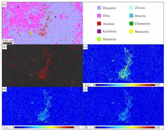 TIMA mineral and REE scanning maps of the representative Lindai bauxite ores. (a) All minerals; (b) anatase; (c) La element; (d) Ce element; (e) Pr element.