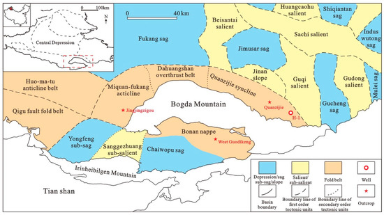 Map showing the location of outcrops and wells around Bogda Mountain in the Junggar Basin, northwestern China [16].