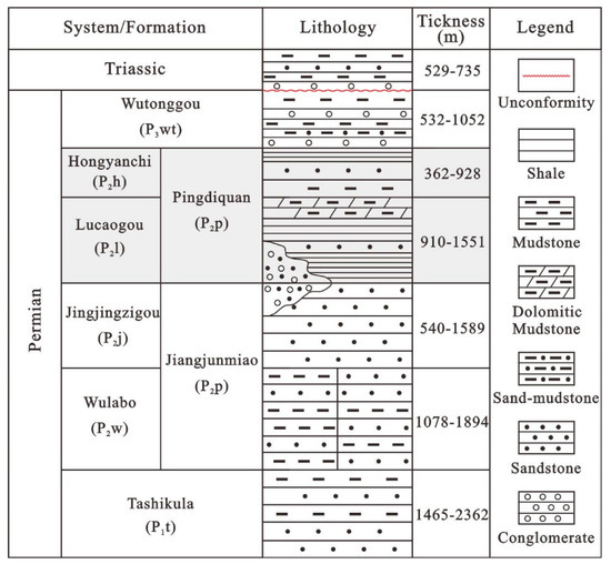 Sediments from Paleozoic to Cenozoic were deposited around the Bogda Mountain, and the thickness of the sedimentary rocks reached 5000 m during the Permian. The Middle Permian around the Bogda Mountain can be divided into four formations (see Figure 2), which are, from the base to the top: the Wulabo (P2w), Jingjingzigou (P2jj), Lucaogou (P2l), and Hongyanchi Formations (P2h); while the northeastern area is divided into two formations: the Jiangjunmiao (P2j) and Pingdiquan Formations (P2p). The best organic-rich sediments were deposited in the Middle Permian Lucaogou Formation (P2l) and Pingdiquan Formation (P2p), which consist of from semi-deep to deep lacustrine shale rich in organic matter with average vertical thicknesses of 900–1500 m (target formation in gray). Shale, mudstone, sandstone, pebbly sandstone, conglomerate, and dolomitic mudstone were discovered in the study area.