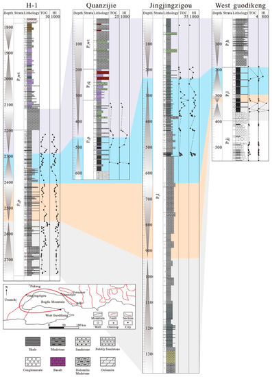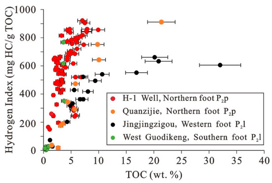 Organic-rich shales are developed in the middle Permian around the Bogda Mountains, and the distributions of these shales are uneven. Two sedimentary cycles can be widely recognized in the middle Permian (P2l and P2p) around Bogda Mountain, which echoes the study conducted in the Jimusaer sag, northeast Bogda Mountain [46,47]. The boundary between these two cycles is formed by a maximum regressive surface, with the granularity of lithology changes from coarse to fine to coarse in each cycle. Organic-rich sediments can be identified in both cycles, with similar abundances and types of organic matter (Figure 3). TOC versus HI is shown in Figure 4. The shales and mudstones collected from both cycles of P2p in the northern Bogda Mountains (the H-1 well and Quanzijie outcrop) were measured to contain 1.48–21.35 wt. % TOC, with HIs of 149-922 mg HC/g TOC. In the western Bogda Mountains, shales and mudstones from the upper cycle in the Jingjingzigou outcrop had TOC contents between 1.16 wt. % and 31.99 wt. %, and the HIs ranged from 27 to 661 mg HC/g TOC. The TOCs of the West Guodikeng outcrops (southern Bogda Mountain) were between 0.27 wt. % and 3.72 wt. %, with the HIs reaching as high as 767 mg HC/g TOC. Table 1 shows the organic geochemical data of the samples analyzed in the laboratory.