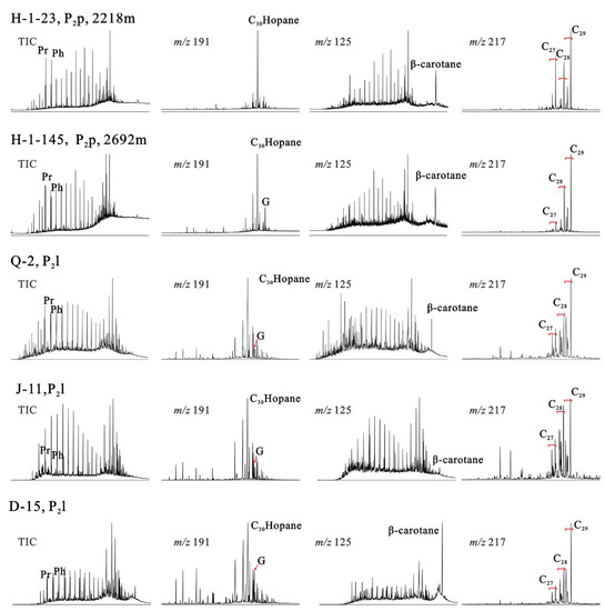 Mass chromatograms (TIC, m/z 191, m/z 125, and m/z 217) showing the distributions of hopanes, steranes, and β-carotanes of sediments in Lucaogou Formation around Bogda Mountain. Note: TIC = Total ion chromatogram; Pr = Pristane; Ph = Phytane; and G = Gammacerane.