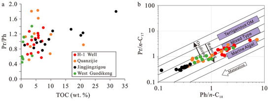 Pristane, Phytane, and n-alkanes are used to study the source input and paleoredox of organic rich sediments in the Lucaogou Formation around the Bogda Mountain [34]. (a): Relationship between Pr/Ph and TOC; (b): Relationship between Pr/n-C17 and Ph/n-C18.