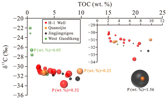 Relationship between TOC and stable carbon isotopic composition. The areal size of points is the abundance of P.