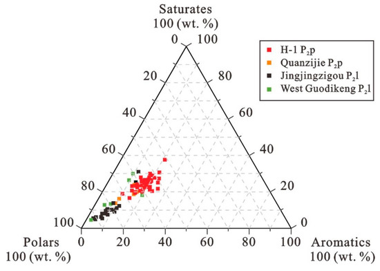 Furthermore, the gross composition of soluble organic matter extracted from sediments was separated into saturated hydrocarbons, aromatic hydrocarbons, and polar components, and the relative abundances of these components are shown in a ternary plot (Figure 9). The polar organic macromolecules containing heteroatoms such as NSO were more abundant in sediments from western Bogda than in samples from the H-1 well and Quanzijie (N Bogda). These results again echo the differences in the HI and organic maceral compositions described above.