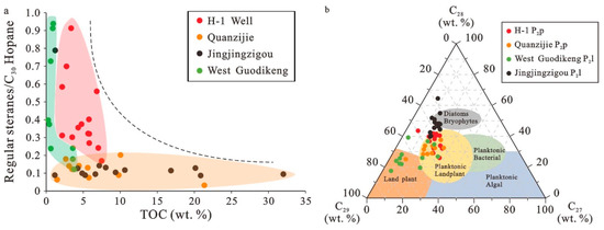 The biomarkers in saturated hydrocarbon fractions are often used to study the sources of organic matter [33,34,35,37]. Hopanes have been proposed to be derived from the cyclization of squalene precursors, which could be biomarkers of bacteria [48,49], and steranes are derived from eukaryotes, likely algae and higher plants [50]. The relative abundances of C30 hopane to regular steranes are shown in Figure 10a. Compared to the H-1 well (NE Bogda) and West Guodikeng outcrop (S Bogda), the contribution of bacteria from Jingjingzigou (W Bogda) was relatively higher, potentially indicating that bacterial reactions consumed the native structure of algae, leading to the accumulation of amorphous organic matter (see Figure 8c). For eukaryotes, the relative abundances of C27, C28, and C29 regular steranes were used to distinguish the aquatic contributions to the organic matter in the sediments from land-derived material [25,51,52,53]. C27 regular steranes have long been considered markers for zooplankton and algae, while C29 steranes are considered markers for land vascular plants [50,54,55,56]. The origin of C28 steranes was proposed to be chlorophyll c-containing phytoplankton, including diatoms, coccolithophores, and dinoflagellates, by Zhang and Sun [26]. The ternary diagram of the relatively regular steranes shows that C29 steranes, followed by ααα20R C28 steranes, were predominant in the sediments sampled in this study (Figure 10b). The source of organic matter in West Guodikeng (S Bogda) was mainly of land vascular plants, which is consistent with the HI data. Multiple inputs from plankton and land plants have been interpreted to form organic-rich sediments in the H-1 well and Quanzijie outcrop; these findings are consistent with the data shown in Figure 6b. On the western side of the Bogda Mountains, the abundance of ααα20R C28 steranes may indicate phytoplankton inputs. However, the absence of any native organic source structure causes it to be difficult to discern the primary input sources. As a result, the organic-rich sediments of Jingjingzigou were thought to be more likely to come from bacterial alteration forming amorphous organic matter.