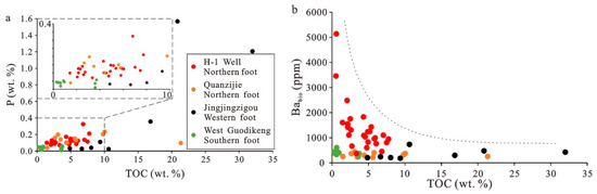 The abundances of P and Ba in sediments have been proposed as proxies of paleoproductivity [42,44,57,58]. P is a structural element in many enzymes, phospholipids, and other biomolecules, and is regarded as a nutrient element that plays a fundamental role in many metabolic processes [59]. However, under anoxic conditions, phosphorus generally diffuses upward from the sediment and returns to the water column, leading to depleted P in sediments. The correlations of P with the TOC contents in the overall samples are shown in Figure 11a. Positive relationships between P and TOC can be observed in the samples collected from Jingjingzigou outcrops (W Bogda; black dots in Figure 11a). However, the enrichment of P did not occur in the organic-rich samples of the H-1 well and Quanzijie outcrops, even though the 13C-depleted organic carbon isotopic composition indicated vigorous primary productivity (Figure 7; red and orange dots in Figure 11a).