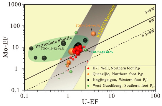 General patterns of UEF and MoEF covariation in modern marine environments were used to assess the paleoredox of samples from Lucaogou Formation [63]. The area size of points shows TOC.
