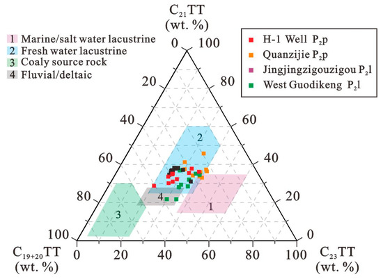 Ternary diagram showing the relative abundance of C19+20TT, C21TT, and C23TT. Based on early published: Zone1 is Marine/salt water lacustrine; Zone2 is Fresh water lacustrine; Zone3 is Coaly source rock; and Zone4 is Fluvial/deltaic [67]; TT = Tricyclic terpane.
