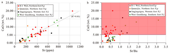 The viabilities of Sr/Ba and S/TOC as elemental proxies for paleosalinity reconstruction have been studied by Wei and Algeo [29]. The solubility of BaSO4 was much less than that of SrSO4, leading to a positive correlation between Sr/Ba and paleosalinity [29,68,69]. The salinity thresholds of Sr/Ba are <0.2 in freshwater, 0.2-0.5 in brackish water, and >0.5 in marine facies. However, a potential issue in using the bulk Sr/Ba value as a paleosalinity proxy of sediments is the alteration of the clay fraction signal by carbonate-hosted Sr. To screen out the influence of carbonate-hosted Sr, the contents of Sr versus CaO were studied as a carbonate proxy, as shown in Figure 14a. A significant positive relationship between Sr and CaO indicates that the influence of carbonate-hosted Sr cannot be ignored when using the bulk Sr/Ba values of the samples in this study. A CaO threshold of 5 wt. % was used to eliminate the samples that probably contained carbonate-hosted Sr [29]. As a result, the Sr/Ba ratios of the H-1 well, Quanzijie, and Jingjingzigou outcrops were mainly of 0.2-0.5 (N and W Bogda), indicating a brackish environment, and those of West Guodikeng in southern Bogda showed a saline lacustrine environment.