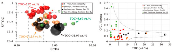 S/TOC is another feasible proxy for paleosalinity [29,30]. Aqueous S migrates into sediments and is mainly in the form of sulfide and organic S, driven by microbial sulfate reduction (MSR). Sulfate concentrations vary strongly between freshwater and brine, leading to S/TOC as a salinity proxy effectively discriminating between freshwater and brackish/marine facies [29,30]. The salinity thresholds for S/TOC are <0.1 in freshwater and >0.1 in brackish and marine facies. The relationship of S/TOC and Sr/Ba can be observed in Figure 15a, with the areal sizes of the points representing the TOC contents. As described above, the valid Sr/Ba ratios of the H-1 well, Quanzijie, and Jingjingzigou outcrops ranged from 0.2 to 0.5. For the H-1 well (red point), the positive covariation of Sr/Ba and S/TOC verifies a change in salinity during sedimentation. However, the relatively low S/TOC values observed in other outcrops may result from the maturation by burial diagenesis leading to a net loss of sulfur [70,71]; this process is also supported by the compositions of i-alkanes and n-alkanes shown in Figure 6b.