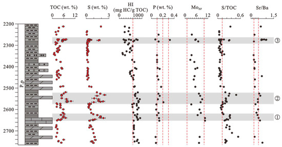 Vertical variation of TOC, S, and geochemical proxies (P, MoEF, S/TOC, Sr/Ba) in Pingdiquan Formation of H-1 Well. The grey shaded zone represents the strata where organic-rich shales are present.