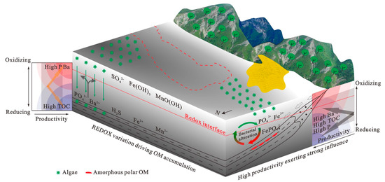 According to the previous discussion, the source of organic matter and paleoredox conditions differed between the H-1 well (N Bogda) and Jingjingzigou outcrop (W Bogda), during middle Permian sedimentation. The geochemical profile of well H-1 is shown in Figure 16. Three organic-rich sedimentary layers can be observed with TOC contents higher than 5 wt. %. Based on Figure 12, the accumulation of organic matter was mainly controlled by the variation in redox conditions. Hydrogen-rich organic matter with high HI values formed in member 1 and member 2 potentially due to better preservation. P and Ba showed an inverse correlation with TOC, indicating an anoxic sedimentary environment, where the reduction in SO42− and hydroxides of Fe3+ and Mn3+ to S2−, Fe2+, and Mn2+ led to the release of P and Ba from the sediments back into the water. In the organic-rich member, the values of both S/TOC and Sr/Ba showed clear, positive relationships to TOC, indicating that an increase in the salinity played a positive role during the accumulation process of organic matter. The relatively hydrostatic, brackish, and stratified anoxic conditions can be outlined in Figure 17. The surface productivity with some original structures could be well preserved during the sinking process, in this less-turbulent water column with stratification.