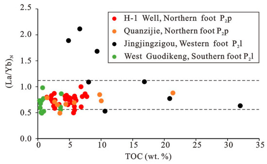 Relationship between the differentiation of REEs and TOC. An inverse correlation between the (La/Yb)N ratio and TOC has been observed in samples from Jingjingzigou outcrops, western periphery of Bogda Mountain.