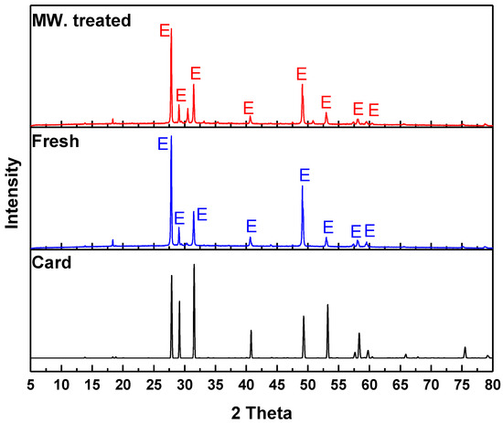 XRD patterns for fresh and microwave treated enargite. E denotes enargite.