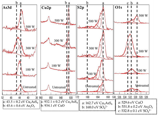 Figure 3 indicates XPS analysis for enargite before and after microwave treatment for 60 seconds. The arsenic 3d peaks show that the formation of arsenic trioxide is observed at 45.6 eV [9] in addition to enargite at 43.5 eV [10]. Copper 2p peaks do not indicate a significant change in enargite at 932.1 eV [10] and cupric oxide at 934.1 eV [11] with increasing microwave power. S2p peaks show enargite at 162.7 eV [10] and the appearance of SO42− at 168 eV [12]. O1s peaks show the presence of cupric oxide at 529.6 eV [13] on enargite surface before treatment and at 500 watts. An arsenic trioxide peak was detected at 531.8 ± 0.2 eV [14] on an enargite and increased after microwave treatment until 300 watts, and then decreased at 500s watt. The decrease in the area of arsenic oxide spectra O1s (531.8 eV) and As3d (45.6 eV) at 500 W compared to 300 W can be attributed to arsenic trioxide (As2O3) having a low boiling point (about 465 °C), and at 500 W, the temperature was enough to evaporate the produced As2O3, decreasing its concentration in the sample. SO4 peak at 532.8 ± 0.1 eV [15] had a similar trend to that of arsenic trioxide, where it increased until 300 watts and then decreased at 500 W.