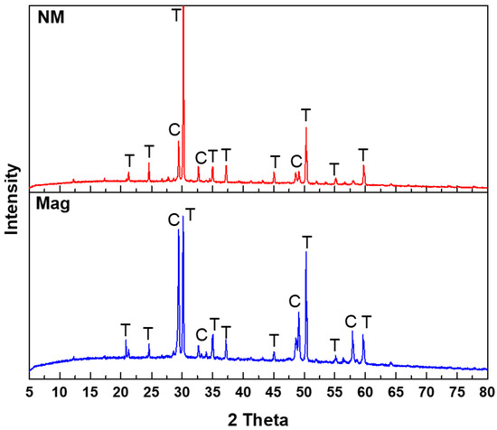 XRD patterns for magnetic and nonmagnetic fraction, C for chalcopyrite, and T for tennantite.