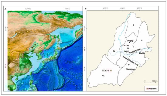 (A) Schematic diagram of Songliao Basin (SLB) and (B) the location of borehole ZKY2-1. I—North Plunge Zone; II—Northeast Uplift Zone; III—Central Deposition Zone; IV—West Slope Zone; V—Southeast Uplift Zone; VI—Southwest Uplift Zone.
