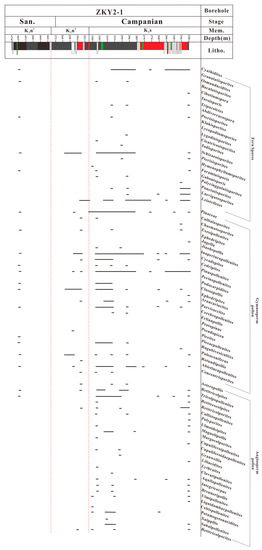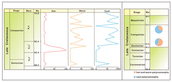 Palynomorphs are abundant in the Songliao Basin, which can reflect the nonmarine Cretaceous paleoclimate, especially the paleoclimatic of East Asia [17,26,43]. The palynomorphs from borehole ZKY2-1 reveal minimal humidity change from K2n1+2 to K2s (or the early Santonian to late Campanian). However, there is an obvious drop in temperature from K2n1+2 to K2s.