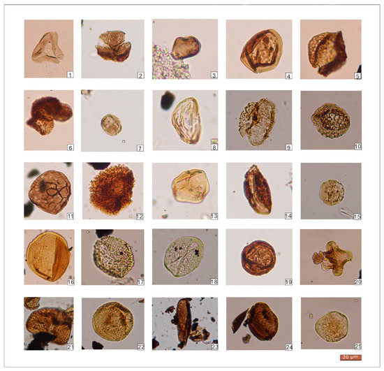 Palynological analyses were performed using samples weighing 30–50 g. The samples were first treated with 10% HCl and 40% HF to remove carbonates and silicates, followed by KOH treatment to discolor organic matter. Then, KI and ZnCl2 were combined into a heavy liquid (2.0 g/cm3) that was used to separate the palynomorphs by flotation. Palynomorph identification and counting were performed at 650× magnification and, if necessary, at 800× magnification by using a Carl Zeiss microscope (Axiolab 5, Carl Zeiss AG, Oberkochen, Germany). Photos were taken using an AxioCam MRc5 digital camera (Carl Zeiss AG, Oberkochen, Germany). Considering the region’s nature, palynomorph identification in this study was mainly based on relevant books [15,19,20].