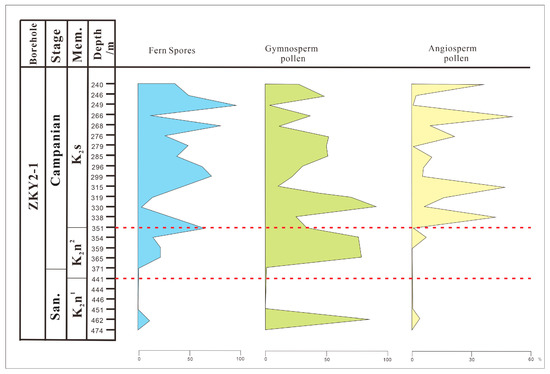 The palynomorphs from borehole ZKY2-1 can indicate the temperature of climate, and among them are hot-type Cheirolepidiaceae (Classopollis); warm-type Bryophyta (Foraminisporis), Osmundaceae (Osmunacidites), Araucariaceae (Callialasporites), Taxodiaceae (Inaperturopollenites); and cool-type Taxodiaceae (Concentrisporites, Exesipollenites), Coniferophyta (Pinaceae, Abietineaepollenites, Pinuspollenites, Cedripites, Parvisaccites, Piceaepollenites, Piceites) [64,65,66,67,68,71]. In K2n1+2, the content of hot palynomorphs is 30.8%, the content of warm palynomorphs is 28.2%, and the cool palynomorphs is 41%. In K2s, the content of hot palynomorphs is 2.1%, the content of warm palynomorphs is 27.7%, and the cool palynomorphs is 70.2%. Summarizing, in the late Santonian–Campanian period, the vegetation generally showed that hot and warm types decreased from K2n1+2 to K2s, and the cool-type increased from K2n1+2 to K2s, indicating that the temperature decreased from late Santonian to early Campanian K2n1+2 to late Campanian K2s (Table 3).