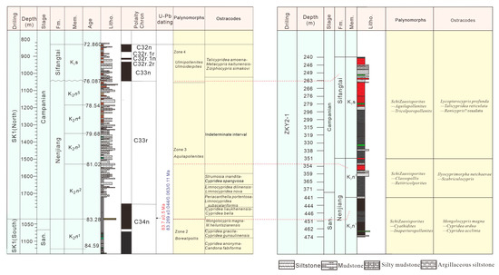 The Late Cretaceous integrated stratigraphic framework has been established based on borehole SK1 [22,23,36,37,39]. Therefore, comparing other boreholes and borehole SK1 is very important (Figure 6). A large-scale lake invasion occurred during sedimentation of the lower K2n1 and lower K2n2, depositing two sets of black mudstone, shale, and oil shale [48,49]. The bottom of both K2n1 and K2n2 in boreholes SK1 and ZKY2-1 are mainly characterized by black shale and mudstone. Thus, the boundary of K2y/K2n1 and K2n1/K2n1 can be easily recognized [50]. Owing to tectonic uplift, there is a widespread stratigraphic hiatus between K2n and K2s [51]. From K2n to K2s of borehole SK1, there may be 3.8 myr of stratigraphic hiatus [38]. In borehole ZKY2-1, the stratigraphic hiatus is much longer than that of borehole SK1 because there are no K2n3 to K2n5 strata [27]. K2s is composed of dark gray, gray mudstone, and grayish green, light gray siltstone [52]. Borehole SK1 mainly revealed greenish gray mudstone and silty mudstone, light gray fine sandstone and siltstone, and grayish brown silty mudstone [53]. ZKY2-1 revealed mainly gray and dark gray mudstone, siltstone, fine sandstone, and medium sandstone, similar to borehole SK1.