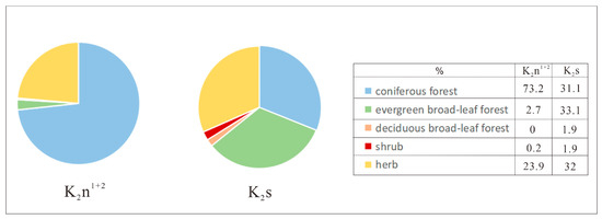 According to the palynomorph assemblage reaction of the late Santonian–Campanian period in borehole ZKY2-1, the K2n1+2 record comprises high amounts of coniferous forest and some content of herb. Coniferous forest and herb are the dominant vegetation types. As herb content increases, coniferous and evergreen broadleaf forests have some content throughout the sedimentation of the K2s. The vegetation types were herb and broadleaf mixed forest during this period. A comparison analysis between K2n1+2 and K2s reveals that from late Santonian–earliest Campanian to late Campanian, the vegetation type of NE Asia changed from coniferous forest and herb to herb and herb–broadleaf mixed forest (Figure 7, Table 2).