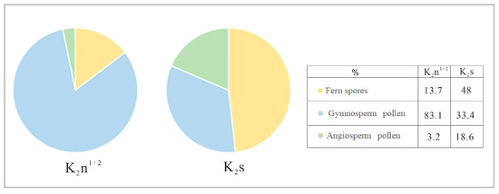 The Schizaeoisporites–Classopollis–Retitricolporites assemblage belongs to K2n2. Gymnosperm pollen is most abundant (33.3%–78.1%), followed by fern spores (14.8%–66.6%), and angiosperm pollen (0%–8.2%). Schizaeoisporites are dominant (0%–100%) among the fern spores. Among the pollen of gymnosperms, including Paleoconiferus, Classopollis, and Inaperturopollenites, Classopollis possesses a larger percentage (21.1%–82.3%), while Paleoconiferus and Callialasporites are common. The angiosperm pollen, including Asteropollis, Retitricolpites, Retitricolporites, Triphyllopollis, and Retitricolporites (0%–33.3%), have a certain amount.
