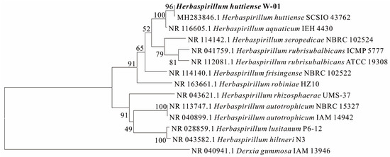 Due to the fact that anorthite is a silicate mineral, nine strains with the ability of decomposing silicate minerals were initially screened from the soil, and three strains with stable growth and good decomposing effect on anorthite were obtained by re-screening with anorthite as the only source of calcium, which were named W-01, W-02 and W-03. By comparing the decomposition effect of three strains on anorthite, it was found that strain W-01 had a significantly better decomposition effect, growth rate and growth stability than W-02 and W-03. Therefore, W-01 was selected as the target strain to leach calcium from anorthite in this study, identified by morphological characteristics and 16S rRNA sequence analysis. The concatenated sequences were compared in the ncbi database (https://blast.ncbi.nlm.nih.gov, accessed on 2 March 2023). The phylogenetic tree was constructed by the neighbor-joining method using MEGA version 11.0 with the Kimura 2-parameter model, the robustness of the tree was evaluated by performing bootstrap analyses based on 1000 replications, and the result is shown in Figure 1. It was found that the similarity between strain W-01 and Herbaspirillum huttiense strain NBRC 102521 is 100%.