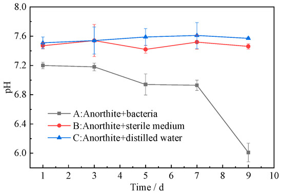 The pH values of the fermentation measurement from bacterial pretreatment of anorthite are shown in Figure 2. It indicated that under the action of bacteria, the pH value of fermentation broth declined significantly with the extension of time. The pH value basically remained around 7.20 in 1∼3 days, slowly decreased from 7.18 to 6.93 in 3∼7 days, and rapidly decreased from 6.93 to 6.01 in 7∼9 days. This indicated that during 7∼9 days, bacteria could release more acidic metabolites, resulting in a significant decrease in the pH value of fermentation broth [12]. The pH value of control group B was maintained at about 7.50, which was slightly lower than that of system C.