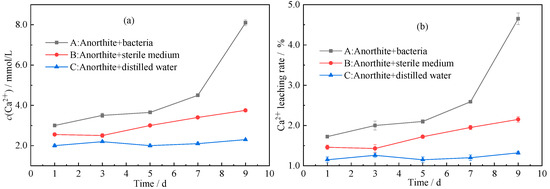 To investigate the influence of bacteria on the dissolution of Ca2+ in anorthite, three different groups were set: bacterial action (A); sterile medium action (B); distilled water action (C), as shown in Table 2. Specific test operation was as follows: For the A and B group, 100 mL modified silicate bacteria medium (initial pH was 7.2, no CaCO3 was added to ensure no initial Ca2+ in the medium) was added into 250 mL polyethylene conical flask. For group C, the medium was replaced by 100 mL of distilled water for comparison. Next, groups A, B and C were added with 5.0 g anorthite and sterilized at 121 °C for 20 min. After that, 5 mL of activated bacterial solution, 5 mL of sterile medium and 5 mL of distilled water were inoculated into groups A, B and C, respectively. Then, the leaching test was conducted in an incubator at 30 °C and 150 r/min. Three parallel tests were set in each group, and the average values were reported.
