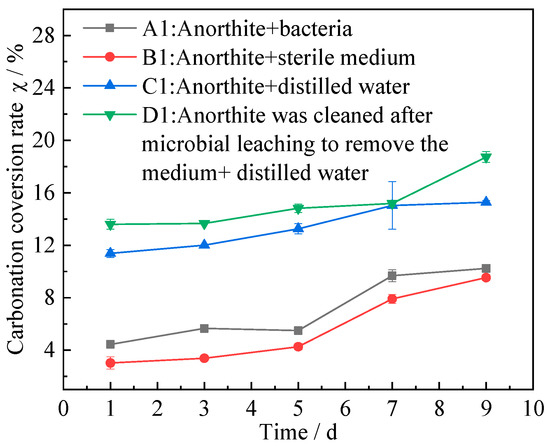 The results of carbonation conversion of anorthite in different systems are shown in Figure 4. It can be seen that the carbonation conversion rate of anorthite in different systems increased with the extension of leaching time within 1∼9 days of leaching treatment. After 9 days of treatment, the carbonation conversion rate of anorthite in system A1, B1 and C1 reached 10.24%, 9.53% and 15.28%, respectively. The carbonation conversion rate of anorthite in system A1 was always higher than that in system B1, indicating that the enhanced reactivity of anorthite after microbial pretreatment was more conducive to the carbonation reaction [15]. From the carbonation results of A1 and B1, it was indicated that the dissolution of Ca2+ in anorthite under the action of microorganisms can promote the carbonation reaction. By comparing the conversion of C1 and D1, it could be seen that the calcium in the anorthite destroyed by microorganisms is further dissolved under the carbonation reaction conditions (150 °C, 5 MPa), which was the fundamental reason for the carbonation conversion rate of C1 being higher than that of D1. In conclusion, both the increase in Ca2+ leaching rate of anorthite and the destruction of anorthite crystal structure resulting from bacteria pretreatment strengthen the process of carbon dioxide sequestration in anorthite [23]. However, the carbonation conversion rate of anorthite in system C1 was higher than that in system A1 and system B1. This phenomenon was possibly due to the fact that the sucrose and other inorganic salts in the medium may have a certain limiting effect in the dissolution or precipitation of CO2, thus inhibiting carbonation. To avoid the influence of the medium components on the carbonation reaction, the anorthite after microbial leaching was cleaned to remove the medium by distilled water, and then the carbonation test was conducted in the distilled water environment (group D1). After 9 days of microbial leaching, the carbonation conversion rate of anorthite of group D1 can reach 18.74%, which was 3.46% higher than that of system C1. It was further verified that bacteria could improve the carbon fixation effect of anorthite, and that sucrose and other inorganic salts in silicate bacteria medium showed a certain inhibition effect on carbonation. This result implied that the removal of medium components is very important and necessary for the mineral carbon sequestration effect enhanced by bioleaching.