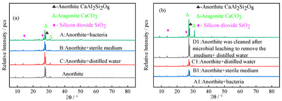 After 9 days of microbial treatment, the phase analysis was conducted on the anorthite leaching residue and the corresponding carbonated products, and the results are shown in Figure 5. It can be seen from Figure 5a that the corresponding peaks of anorthite (2θ = 27.8°) and aragonite (2θ = 27.2° and 31.2°) were strongly weakened after leaching, and the weakening degree was more obvious under the action of microorganisms. However, the corresponding peak of silica at 2θ = 26.3° was enhanced, which was due to the relative increase in silica content at the same time of Ca2+ leaching. Figure 5b shows that there is no new peak in the carbonation products formed under the conditions of distilled water, sterile medium and leaching fermentation solution after microbial action, while the carbonation products after microbial action and cleaning of the medium show a strong peak corresponding to aragonite at 2θ = 31.2°, indicating that the carbonate mineral generated by the reaction was aragonite calcium carbonate.