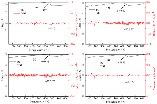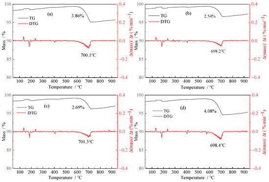 Thermogravimetric curves of anorthite and its leaching residue: (a) Anorthite; (b) Anorthite + distilled water; (c) Anorthite + sterile medium; (d) Anorthite + bacteria.