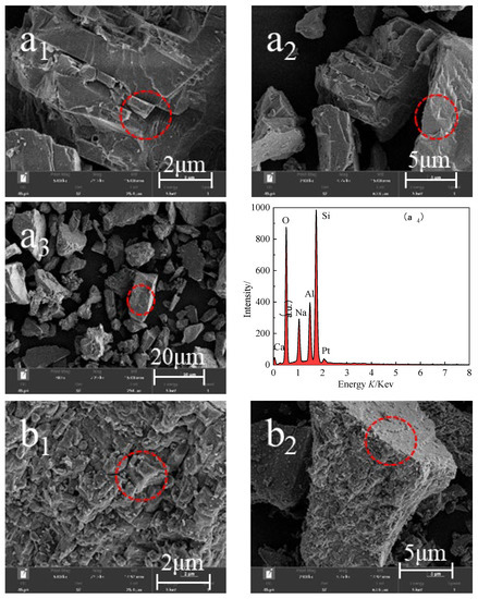 SEM-EDS was used to analyze the morphology and element composition of anorthite, leaching residue and carbonation products. The results are shown in Figure 9. As shown in Figure 9a1–3, the anorthite particles showed irregular morphology of fragmentation, the dissociation surface was smooth, and the edges were clear and angular. The corresponding energy spectrum (Figure 9a4) showed that the main elements contained O, Na, Al, Si and Ca. After microbial treatment (Figure 9b1–3), the anorthite dissociation surface became rough, and there were many tiny spots that may be the attached bacteria. No obvious grooves and holes were found on the leaching residue, and the dissolution was obvious at the corners. It can be seen that Herbaspirillum huttiense W-01 would cause the weathering of anorthite by adsorbing on its surface and producing acidic metabolites (Figure 2), which decomposes anorthite, most easily at the edges and corners. The energy spectrum of leaching residue showed (Figure 9b4) that the main element species showed no change; however, the content of O, Na, Al, and Si elements decreased significantly, suggesting the occurrence of a dissolution phenomenon. In addition, BET-specific surface area test results (Table 4) showed that the specific surface area of anorthite treated by microorganisms increased by 0.4696 m2/g, indicating that microbial action promotes the leaching of Ca2+ and results in the increase of the specific surface area of anorthite. The carbonated products were fine particles, which aggregated with each other to form some dense clusters, as shown in Figure 9c1–3. It can be also seen that there is a small number of flake crystals in the products, which were calcium carbonate generated by the carbonation reaction. Few small flake crystals also suggested a relatively low carbonation conversion rate. The energy spectrum showed (Figure 9c4) that compared with the leaching residue, the contents of C, Ca and O in the carbonated products were significantly increased, which was due to the fact that the carbonation reaction fixed CO2 in the solid phase products. This resulted in an increase in the contents of C and O in the products. It was worth noting that the leaching rate of Ca2+ (Figure 3) and the final carbonation conversion rate (Figure 4) were not equal, which indicated that microorganisms enhance the carbon sequestration effect mainly by destroying the crystal structure (Figure 9a,b) and enhancing the reactivity of anorthite.