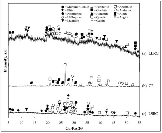 The XRD patterns of each raw material are shown in Figure 1. From these results, it was detected that LLRC had various minerals, such as nontronite, montmorillonite, lizardite, forsterite, halloysite, andesine, anorthite, hematite, goethite and quartz, as shown in Figure 1a. On the other hand, CF contains minerals such as albite, calcite, forsterite and quartz. Meanwhile, LSBC had various minerals identified, as shown in Figure 1c, minerals that were predominantly detected include anorthite, andesine, montmorillonite, illite, nontronite, lizardite, augite and quartz. Quartz is the common mineral present in the three raw materials. Minerals such as montmorillonite, lizardite, anorthite, andesine and quartz present in LLRC and LSBC are few of the minerals that were also found in silts from Philippine nickel laterite mine waste [,,], which is also from the southern Philippines. The summary of the minerals with their corresponding formula is presented in Table 3.