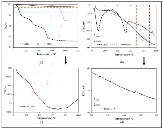 Results on the TGA-DTA of the three raw materials are shown in Figure 4. The total weight losses from heating LLRC, CF and LSBC are 20.49%, 9.44% and 0.88%, respectively, as indicated in Figure 4a. The DTA curve measured from LLRC has three endothermic reactions and two exothermic reactions, as shown in Figure 4b. The first endothermic peak is observed at 97.62 °C and is related to the elimination of free water [,,,]. The second endothermic reaction is observed at 287.62 °C which is due to the pre-dehydration of clay minerals []. The third endothermic reaction is at 525.37 °C, which is attributed to the dehydroxylation of minerals [,,]. The first exothermic reaction is observed at 313.76 °C and is related to the burning off of carbonaceous matter []. An exothermic peak is also seen at 939.72 °C which is due to decomposition of montmorillonite and the formation of defect such as aluminum-silicon spinel (Si3Al4O12) structures (structural reorganization), and some amorphous phases [,,,]. On the other hand, CF exhibited an endothermic reaction at 786.39 °C, as shown in Figure 4b, which is related to the decomposition of calcite [,], corroborating the presence of calcite in the XRD results. Meanwhile, no distinct phase transition is observed on the DTA curve of LSBC up to 700 °C (Figure 4d); however at the temperature range 700–900 °C, two exothermic peaks are observed at 737 °C and 840 °C, which are due to the oxidation phenomenon, and might also be attributed to the allotropic transformation of iron oxide [,] in the LSBC. The curve might also indicate overlapping of reactions that created a trough with a wide temperature range.