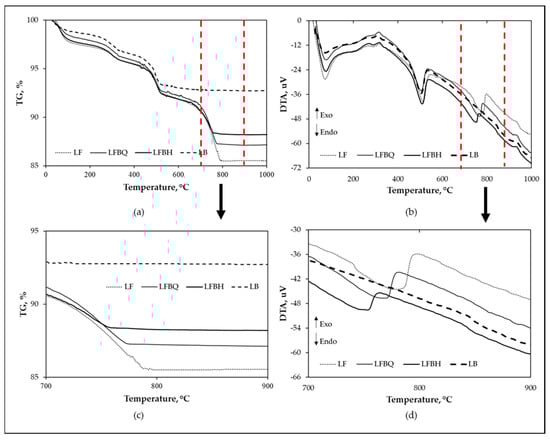 The thermogravimetric behavior of the formulated powders was compared to their raw material counterparts. Figure 5a,b shows the DTA curves and mass losses obtained from the thermogravimetric analysis of the formulated powders (LF, LFBQ, LFBH, and LB). All formulated powders displayed a similar behavior on their DTA and TG curves except for sample LB, which had the full replacement of commercial feldspar by the LSBC. It can be seen that the total mass loss of LF, LFBH, LFBQ and LB are 14.48%, 12.83%, 11.78% and 7.26%, respectively. The mass loss decreased as LSBC was increased, which concurs with the TGA result of LSBC. In the DTA curves (Figure 5b), three (3) endothermic peaks and two (2) exothermic peaks were identified. The first region shows an endothermic reaction occurred at 73.29 °C, 76.32 °C, 75.83 °C and 75.35 °C for LF, LFBQ, LFBH and LB, respectively, and is related to the release of free and adsorbed water [,,,]. The second region presents an exothermic peak observed at 315.91 °C for LF, 313.97 °C for LFBQ, 317.18 °C for LFBH, and 309.48 °C for LB, which could be attributed to the burning off of carbonaceous matter [] from LLRC. The third region is an endothermic peak observed at 512.62 °C for LF, 504.75 °C for LFBQ, 509.85 °C for LFBH and 504.97 °C for LB, associated with the loss of the hydroxyl group from the red clay (LLRC) [,,]. The fourth region are endothermic reactions occurring at 775.31 °C for LF, 765.85 °C for LFBQ and 753.00 °C for LFBH, which can be attributed to the calcite decomposition [,] accompanied by significant loss of mass as emphasized in Figure 5c. No distinct phase transformation was observed in the DTA curve of LB at temperatures above 750 °C, as shown in Figure 5d, which is consistent with the DTA of LSBC, as shown in Figure 4. The decomposition of montmorillonite and formation of defect such as aluminum-silicon spinel (Si3Al4O12) structures (structural reorganization), and some amorphous phases [,,,] are attributed in the last region on the DTA curve, which is an exothermic peak at 923.41 °C, 930.25 °C, 936.94 °C, and 936.03 °C for LF, LFBQ, LFBH and LB, respectively. At these high temperature levels, the Fe ions in this region caused the clay to dissolve and disperse [,]. Since LSBC has a higher iron content than CF, a distinct difference of the porosity and water absorption was observed with LB, which is shown in Figure 6.