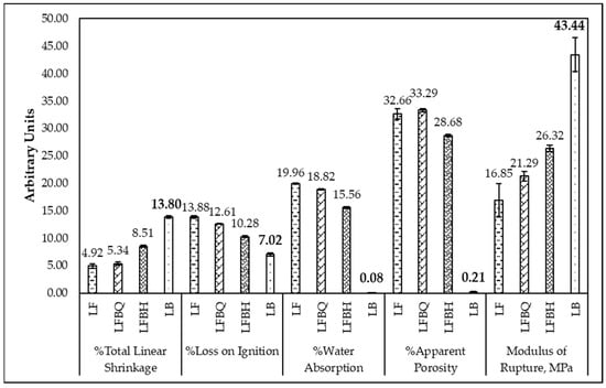 Test bars produced from the different formulations were further characterized in terms of their physical and mechanical properties. The average results on total linear shrinkage, loss on ignition, water absorption, apparent porosity, and modulus of rupture are shown in Figure 6. The average total linear shrinkage increases as the LSBC content is increased, which could be attributed to its low silica content, as shown in Table 2. The loss on ignition decreases as the LSBC content is increased, which means the high loss on ignition of the test bars is primarily contributed by LLRC and CF, and is thus consistent with the TGA behavior of LLRC and CF shown in Figure 4a. In addition to reducing the loss on ignition, there is also further reduction of the water absorption and apparent porosity upon increasing the amount of LSBC. Thus, lowering the water absorption and apparent porosity is evident when LSBC partially replaced commercial feldspar, starting with LFBQ exhibiting a higher MOR than LF. Such that LB bars with full replacement of feldspar with LSBC obtained the highest MOR of 43.44 MPa. LB bars were highly vitreous, exhibiting a low average water absorption of less than 0.08%. The higher iron content of LSBC than CF could have resulted in more dissolution of clay [,] in the bar matrix, which further increased the formation of a large amount of liquid phase which penetrated the structure’s open pores and resulted in densification by liquid phase sintering [,]. The densification of these pores will increase the solid matter in the matrix of the bars in resisting any applied load to fracture the tiles, consequently increasing its strength against fracture or its modulus of rupture. Moreover, bars from this study have lower water absorption and higher MOR than NMW tiles [] even if the latter has higher flux/silica ratio since those were fired at a lower temperature.