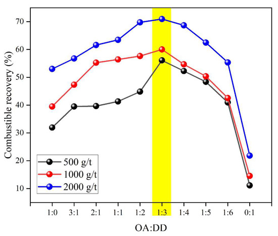 The combustible recovery results are shown in Figure 3. Obviously, when OA:DD = 1:3, the combustible recovery is the highest and the flotation result is optimal regardless of the dosage of compound collectors. Furthermore, the combustible recovery increases with the increase in DD proportion when the ratio of OA:DD is less than 1:3 and decreases when it is larger than 1:3. This indicates that the OA:DD = 1:3 compound collector has the best effectiveness to enhance the flotation process.