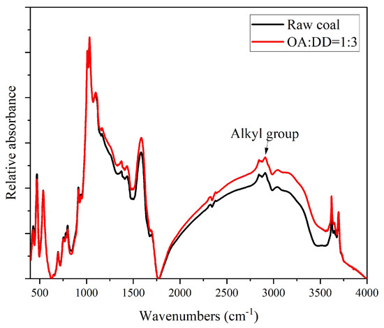 FTIR results of coal samples treated with OA:DD = 1:3 compound collector and raw coal.