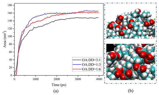 From the spreading area variation curves, it can be seen that in the initial stage of adsorption, the adsorption speed is the fastest with an OA to DD ratio of 3:1 and that the adsorption speed of the other two kinds of compound collectors is close. This indicates that with the proportion of polar content in the compound collectors increasing and the interaction between the compound collectors and LRC is gradually strengthened, that is, the collecting capacity of the compound collectors is stronger. After achieving system stability, the spreading area was observed to be largest at an OA:DD ratio of 1:3 and smallest at a ratio of 3:1. This implies that an increased proportion of polar collectors enhances adsorption speed while decreasing spreading capacity. After detailed observation of the equilibrium spreading structure of the OA:DD = 3:1 compound collector, it is found that some OA molecules self-aggregate in the oil film, as shown in the Figure 7b. This indicates that attractive interaction among OA molecules takes place primarily at high OA contents, thereby reducing OA adsorption on the LRC surface. Consequently, several polar groups of OA orient towards the water phase, and the hydrophobicity of the oil film is reduced.