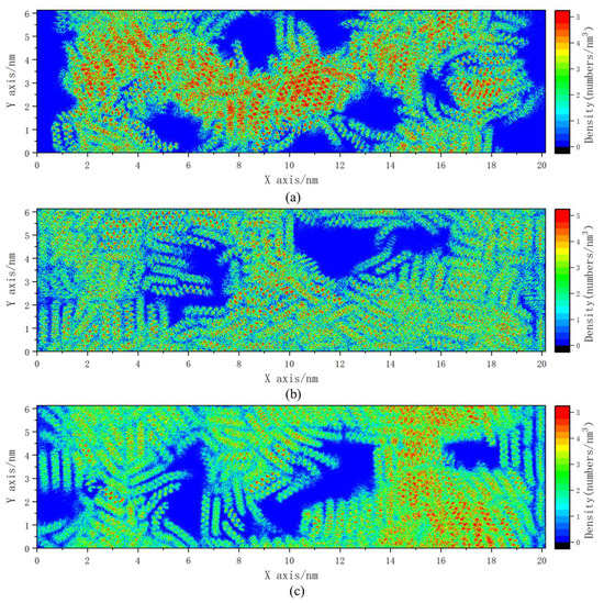 Figure 8 shows the spreading equilibrium structure at 4000 ps. The three kinds of compound collectors can form an oil film. Next, the average 2D numerical density of the oil film along the z-axis is calculated by using the DENSMAP program of GROMACS, as shown in the Figure 9. The trajectory time range is 3000 ps to 4000 ps, and the lattice size is 0.02 nm. It is known that when OA:DD = 1:3, the spreading area of the oil film is the largest. Analysis of Figure 9 shows that when OA:DD = 1:3, the red area is the most evenly distributed. The collector molecules are concentrated in some areas in the other two proportions. It shows that the collector molecules spread most evenly on the surface of LRC when OA:DD = 1:3. Therefore, the spreading of the compound collector with a ratio proportion of OA:DD = 1:3 is the best.