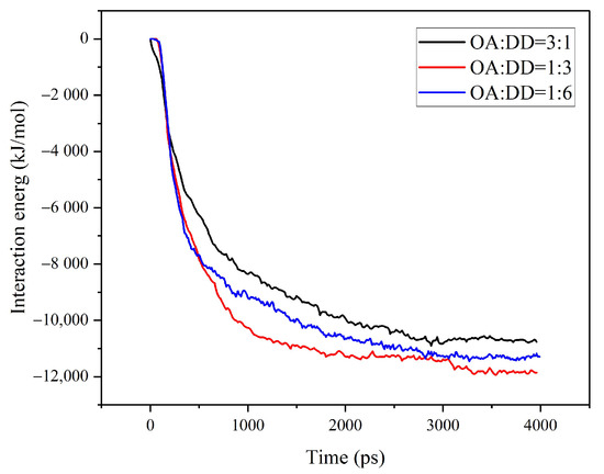 The interaction energy between collectors and both water and the LRC model after equilibrium was subsequently calculated. The results are shown in Table 3. The larger the negative value, the greater the interaction energy. For an OA:DD ratio of 1:3, the interaction energy between collectors and LRC is the largest and is greater than that between the collector and water, resulting in optimal spreading.