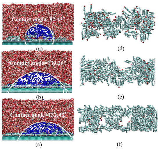 In An’s studies [56,64], the influence of compound collectors composed of DD and OA on the surface contact angle of LRC was investigated. In both of their studies, the compound proportion of OA to DD was fixed at 1:4. The results indicated that the surface contact angle of LRC could be significantly improved when the compound collector was spread on the LRC surface. Zhang et al. [59] also studied the effect of compound collectors on the wettability of LRC surfaces. They investigated the influence of the DTAB:diesel compound proportion on the contact angle, and the results showed that the contact angle reached its maximum value when DTAB:diesel was 1:2, which is consistent with the findings of our study. However, the contact angle simulated in this study is larger than that measured in their experiments. Due to the scale limitations of MD simulations, the contact angle simulated in this study is a nanoscale microscopic contact angle. At the microscopic scale, the contact angle of the LRC surface covered by compound collectors is equivalent to the contact angle of the oil film surface. Due to scale limitations, the adsorption of the collector at the gas–liquid interface, i.e., the formation of an oil ring, has a significant effect on the MD contact angle measurement. Moreover, the smaller experimental contact angle could be attributed to unavoidable surface contamination. Therefore, the contact angle measured in the simulation is larger than that measured in their experiments. This phenomenon has also been observed in similar MD simulation studies [65,66]. Although the MD simulation has some limitations, comparing the contact angle results under identical simulation conditions can provide supporting evidence for our analysis.