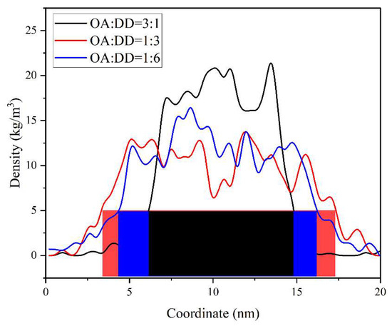 The concentration distribution of nitrogen molecules along the X axis in the adsorption configuration of bubbles on the oil film surface is shown in Figure 12. To facilitate comparison, we move the peak position of the curve to the middle position. The length of nitrogen spreading can represent the bubble adhesion area, which positively correlates to the stability of bubble adhesion to a certain extent. It can be seen that the bubble adhesion area is the largest when OA:DD = 1:3 and the smallest when OA:DD = 3:1, indicating that the bubble adhesion is the most stable when OA:DD = 1:3.